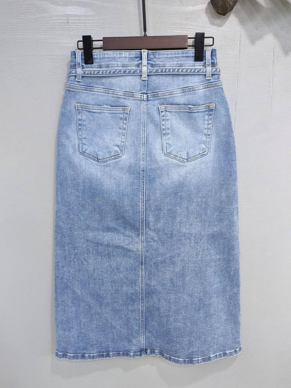 This light blue high-waisted denim skirt features a simple yet modern design, perfectly showcasing a woman’s elegance and confidence. Made from soft and comfortable denim fabric, it undergoes a fine washing process, resulting in a gentle tone and a vintage feel. The high-waisted design not only flatters the waistline but also enhances body proportions, showcasing a natural and flowing silhouette. Whether paired with a T-shirt, shirt, or knitwear, it effortlessly creates a stylish and comfortable everyday look. Suitable for spring, صيف, and autumn, it’s an indispensable versatile piece in your wardrobe.