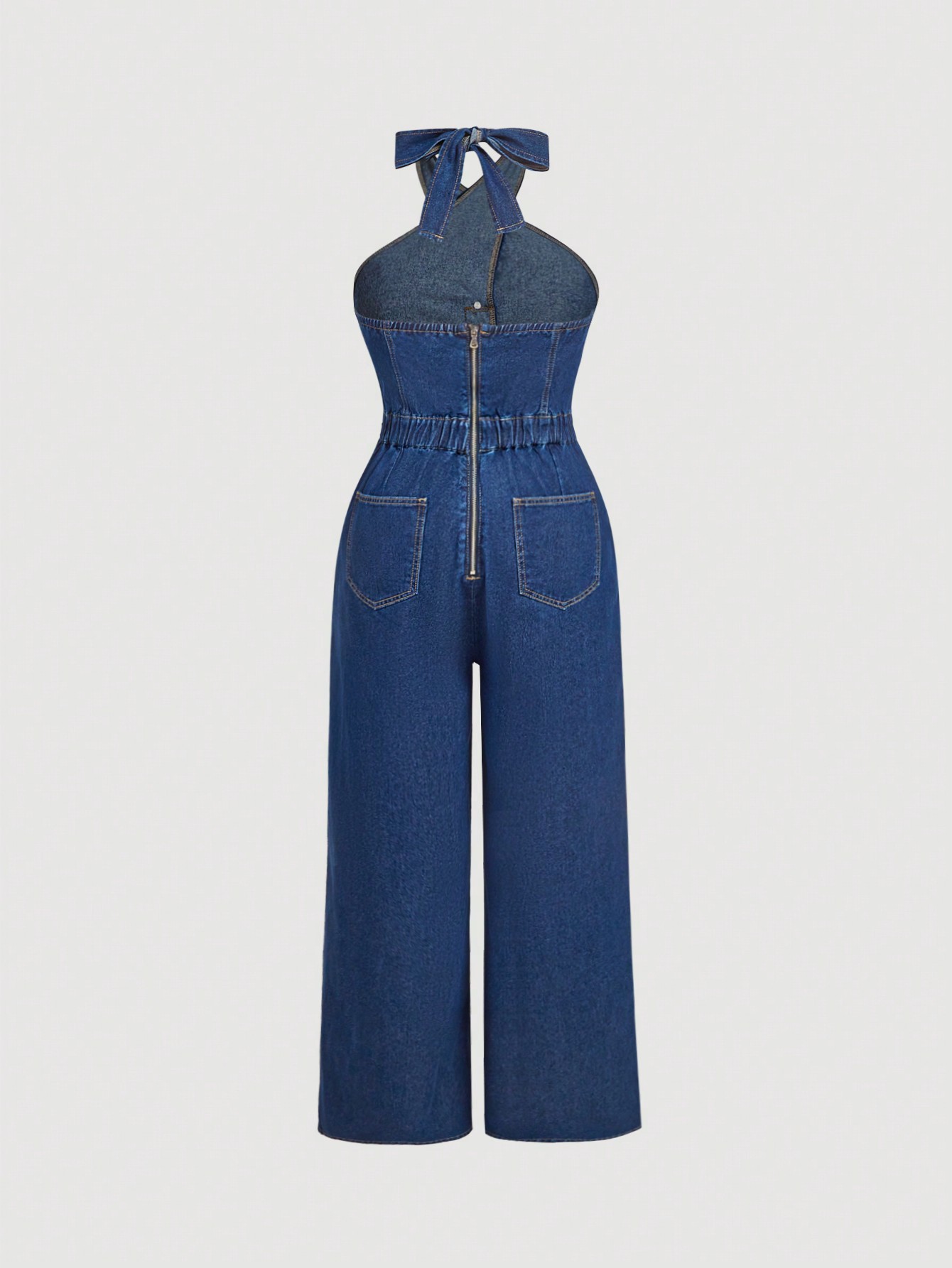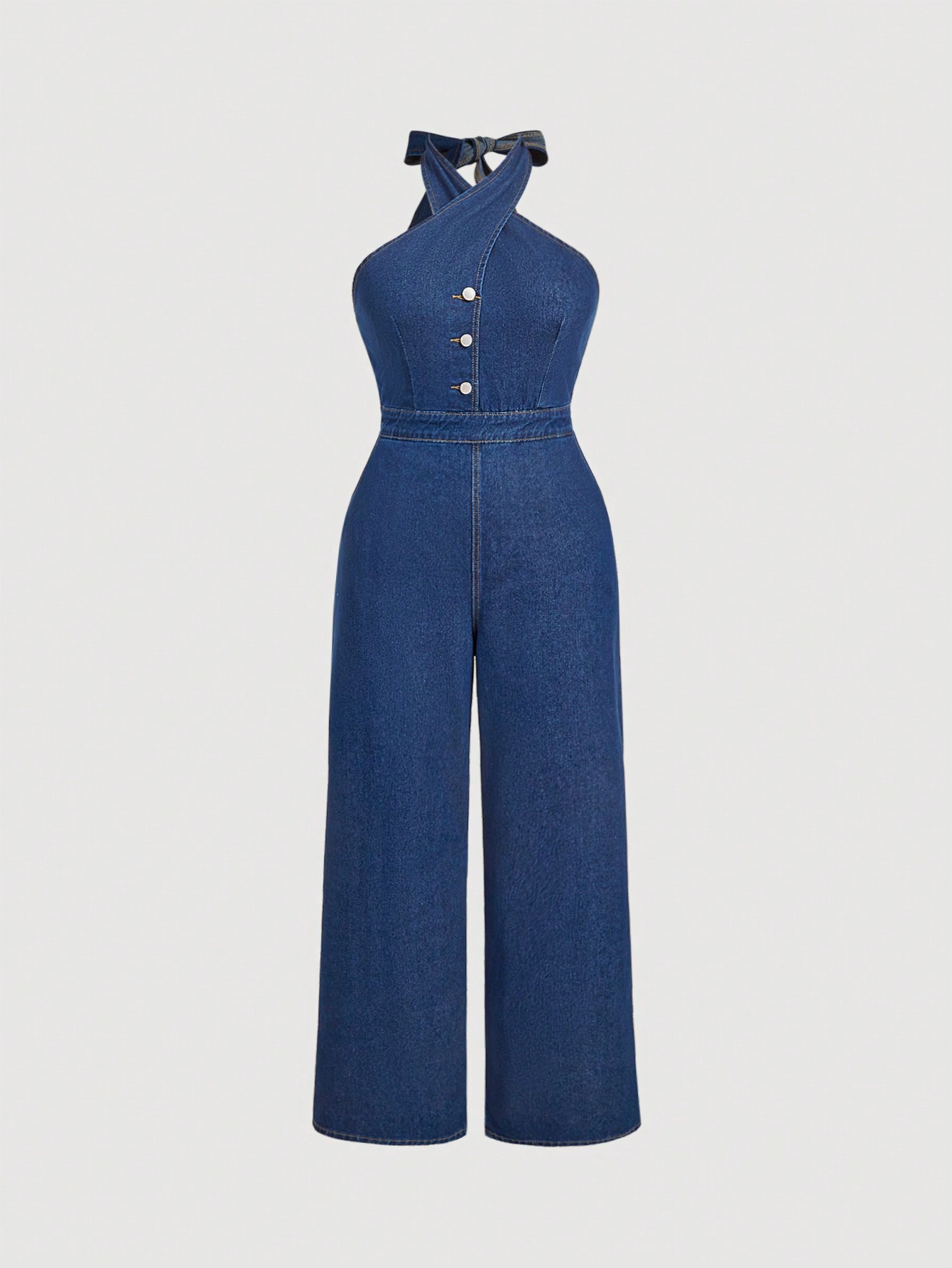 Damen-Jeansoverall mit Knopfleiste vorne, Neckholder, Röhrenoberteil und Taille