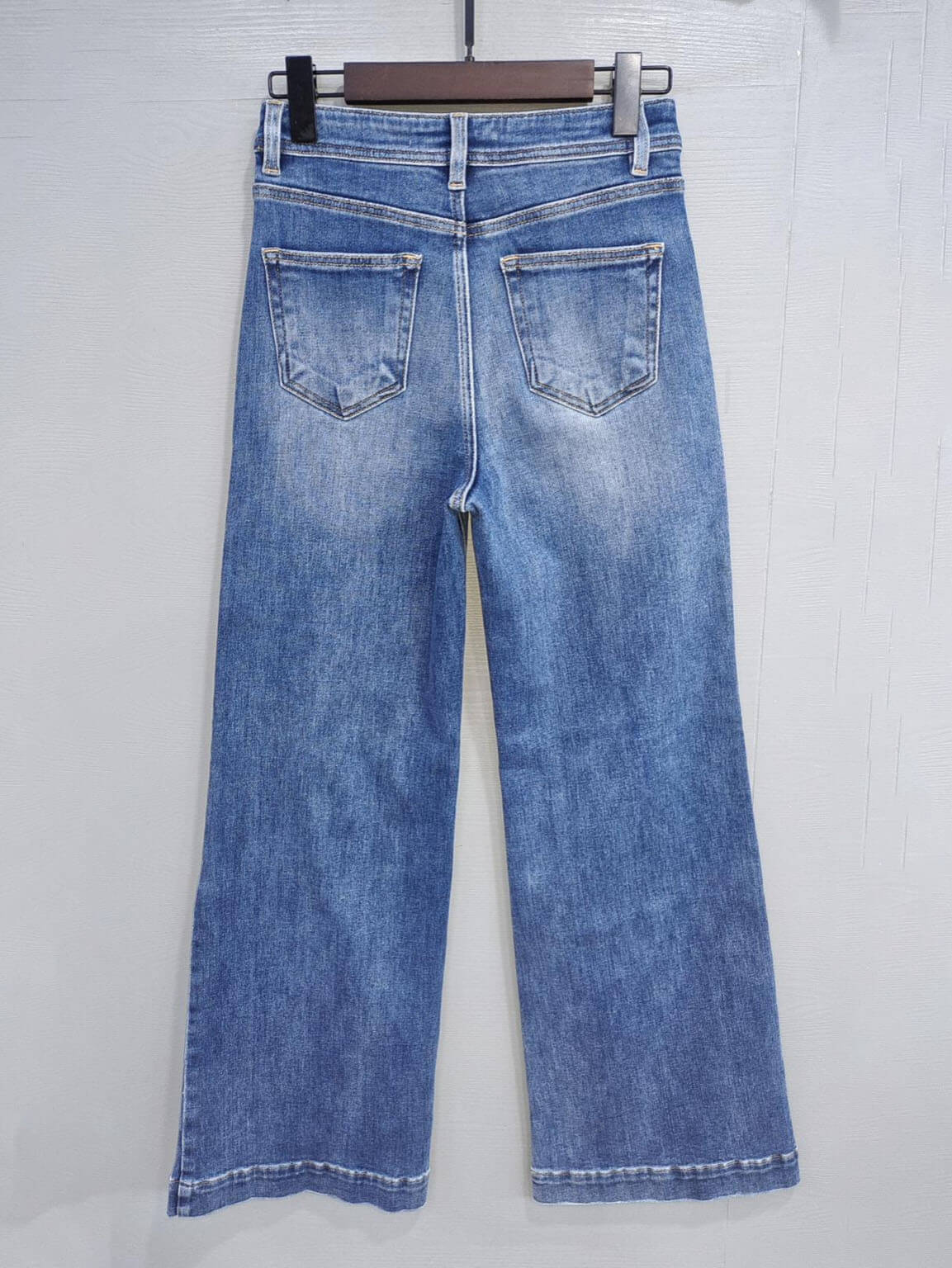 Diese Jeans sind aus klassisch gewaschenem blauem Denimstoff gefertigt, präsentiert eine natürliche Distressed-Textur. Das High-Waist-Design schmeichelt der Taille und optimiert die Körperproportionen, während die weite Beinpassform entspannt und bequem ist. Distressed-Details auf dem Stoff sorgen für einen Hauch von Raffinesse, und das klassische Fünf-Taschen-Design mit Metallknöpfen und Reißverschlüssen vereint Funktionalität und Stil.