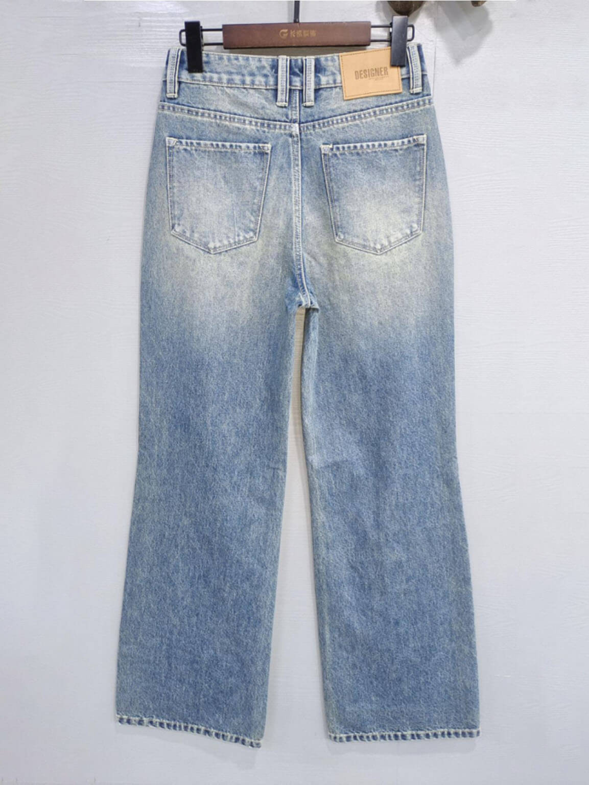 These high-waisted wide-leg jeans are made from premium denim and feature a sophisticated vintage wash finish. The high-waisted design, classic five-pocket design, durable metal hardware, and the signature “DESIGNER” leather patch at the back waistband showcase exquisite craftsmanship in every detail.