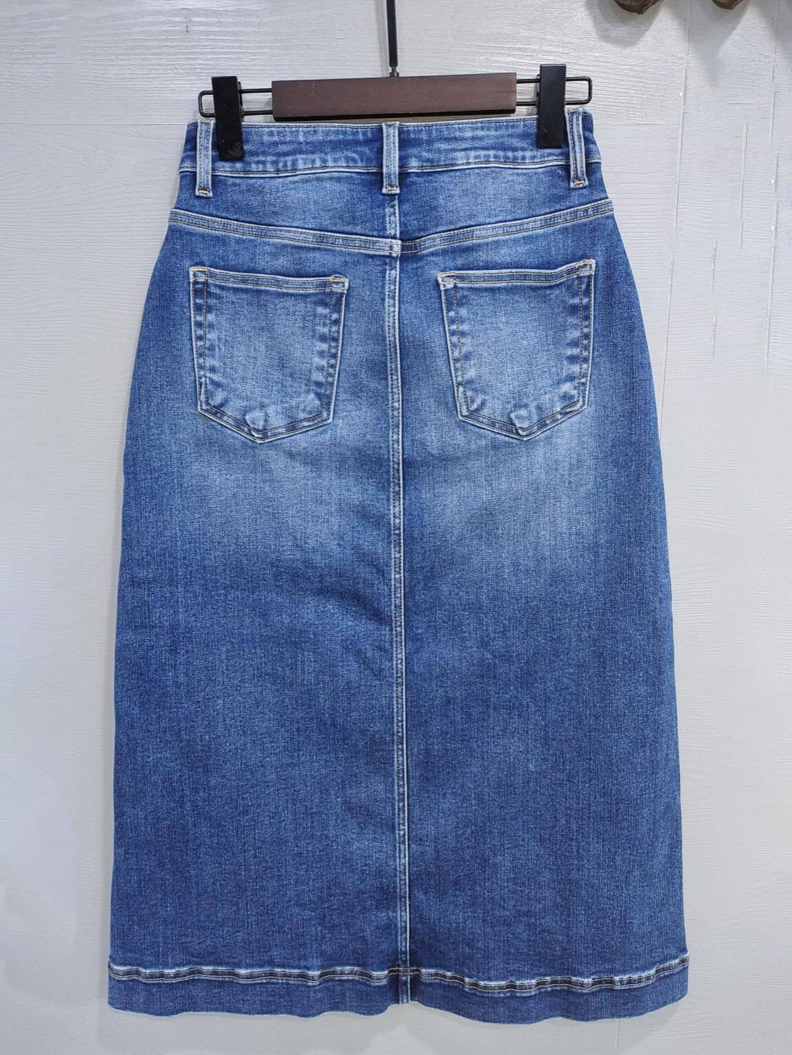This timeless denim A-line skirt is a versatile addition to any wardrobe. Made from high-quality, durable denim, the skirt features a flattering A-line silhouette that provides comfort and style. With a classic blue wash and subtle fading for an effortlessly chic look, it’s designed with functional pockets and a simple front button closure. Whether paired with a casual tee for daywear or dressed up for evening outings, this skirt offers endless styling possibilities.