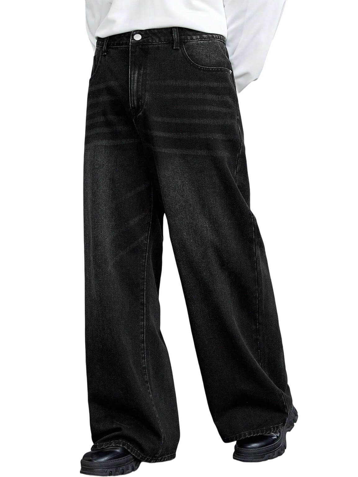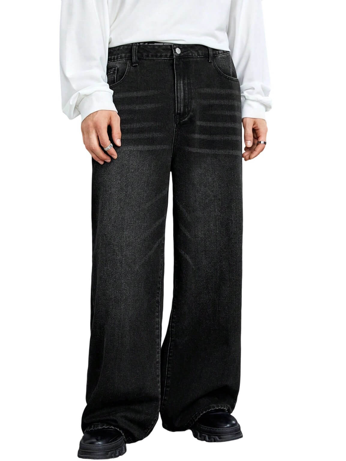 Джинсы с широкими ногами в этих мужчинах ослабленные посадки, наклонные карманы, и естественная средняя талия для повседневного комфорта. Изготовлен из прочной джинсовой смеси с хлопком, Они предлагают современный случайный стиль универсальным серым тоном. Идеально подходит для сочетания с футболками, толстовки, или куртки для внешности в стиле уличной одежды.